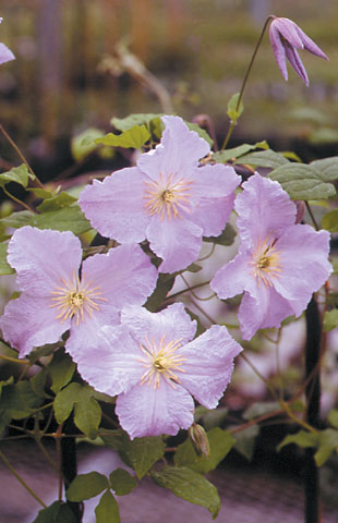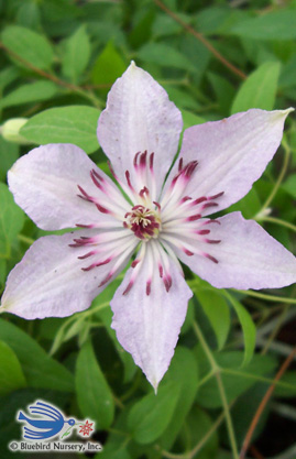 | Description: Pale blue-violet, crepe-like sepals with green-yellow stamens from early summer to early fall. PG3.