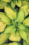 | Description: 2002 Hosta of the Year! Exciting, reverse variegated sport of Hosta 'Fragrant Bouquet' having chartreuse-gold, shiny leaves with a wide, green edge and giant, near white, very fragrant flowers on 30-40" scapes in late summer. Vigorous, mounding plants. |